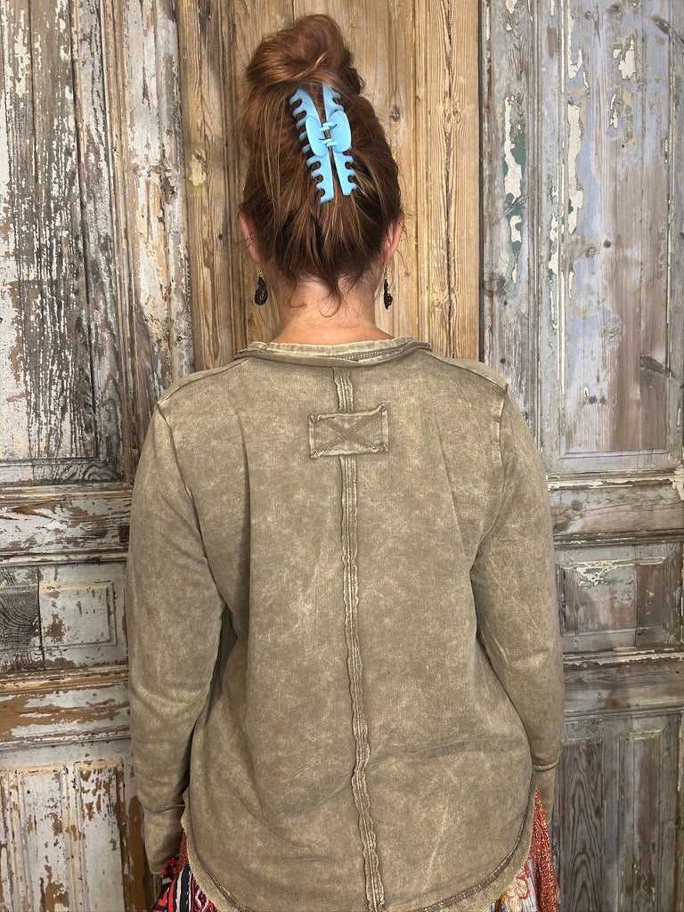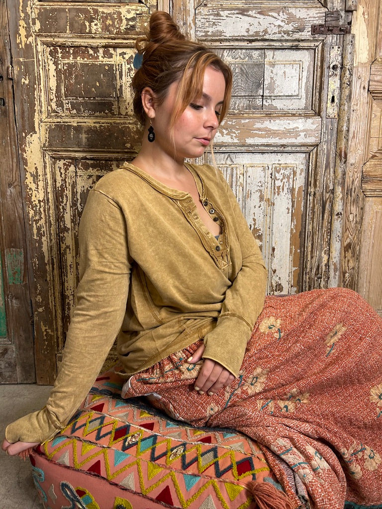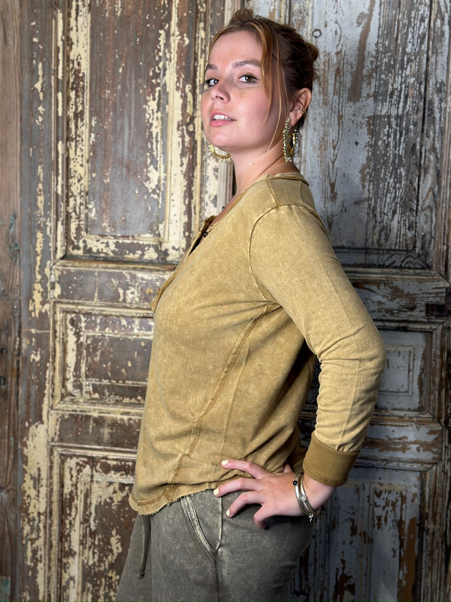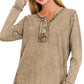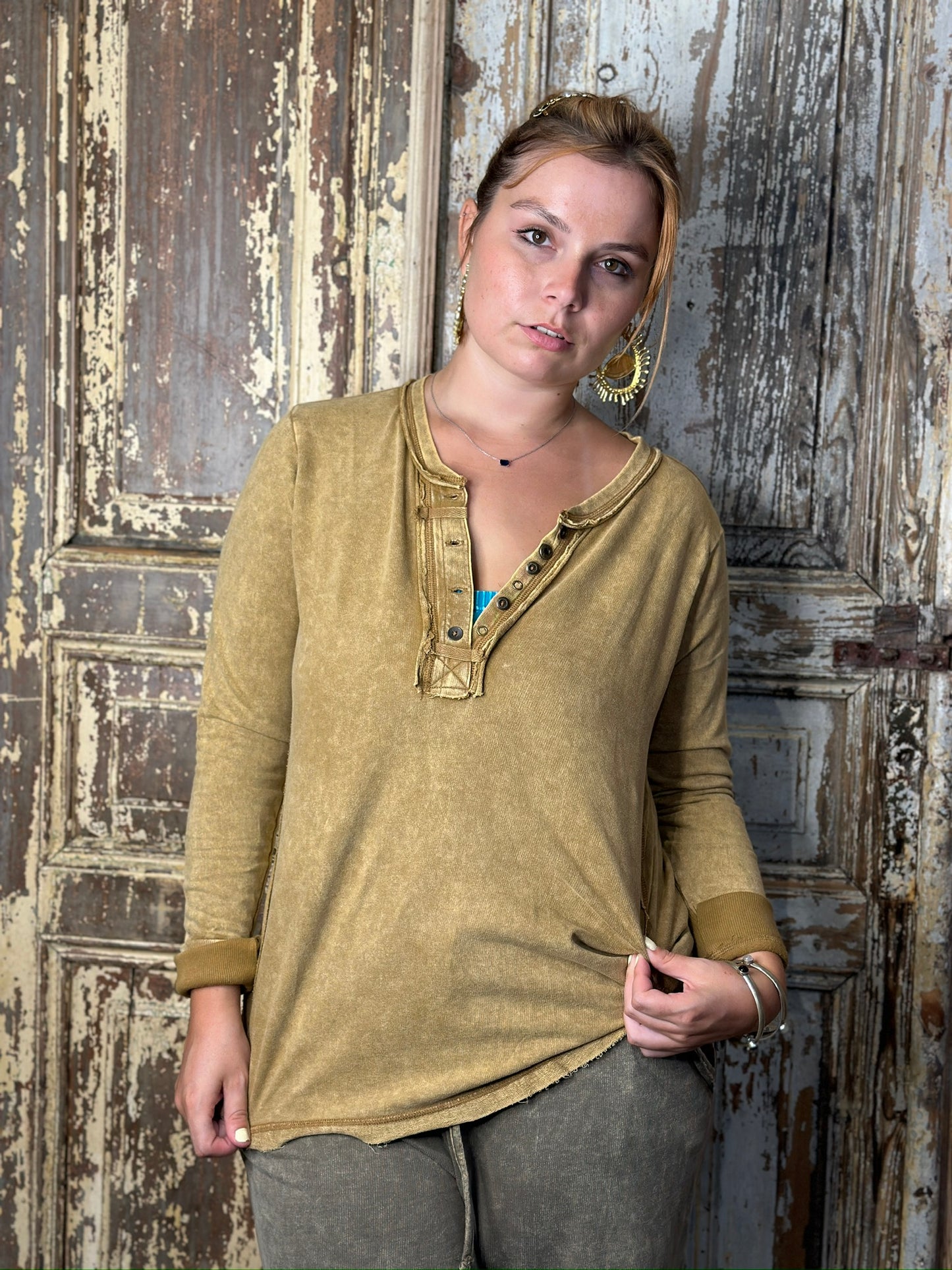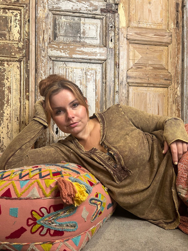 Be casual and stylish with our Thumbhole Cuff Mineral Washed Henley! Its vintage look will make you stand out in a crowd. The thumbhole adds a cool look! Oversized for a modern, fashionable fit. Get ready to rock with our stylish henley!