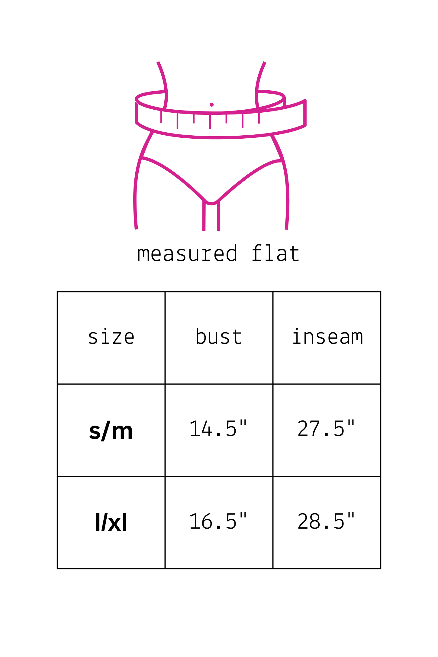 L/XL: Waist 16.5" Rise 15" Inseam 27.5" Length 41"