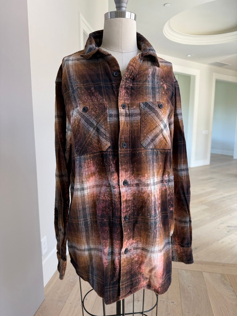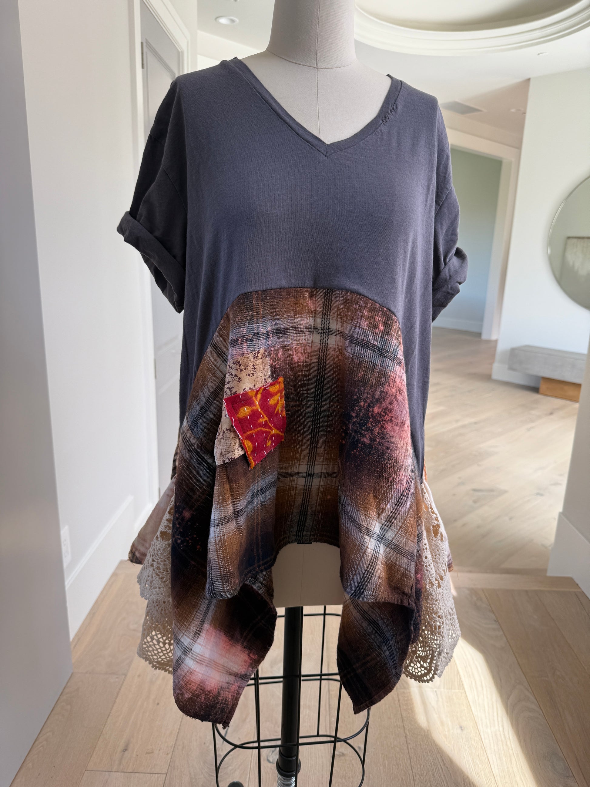 Meet your new go-to: the Upcycled V-Neck Tunic, handmade with heart and a whole lot of style. We start with a gently used cotton V-neck tee, then add two cut-up, bleached flannels to create a flowy, layered bottom. Random patches on the front and back give it a one-of-a-kind, lived-in charm, while light distressing adds that just-right touch of grunge and character.