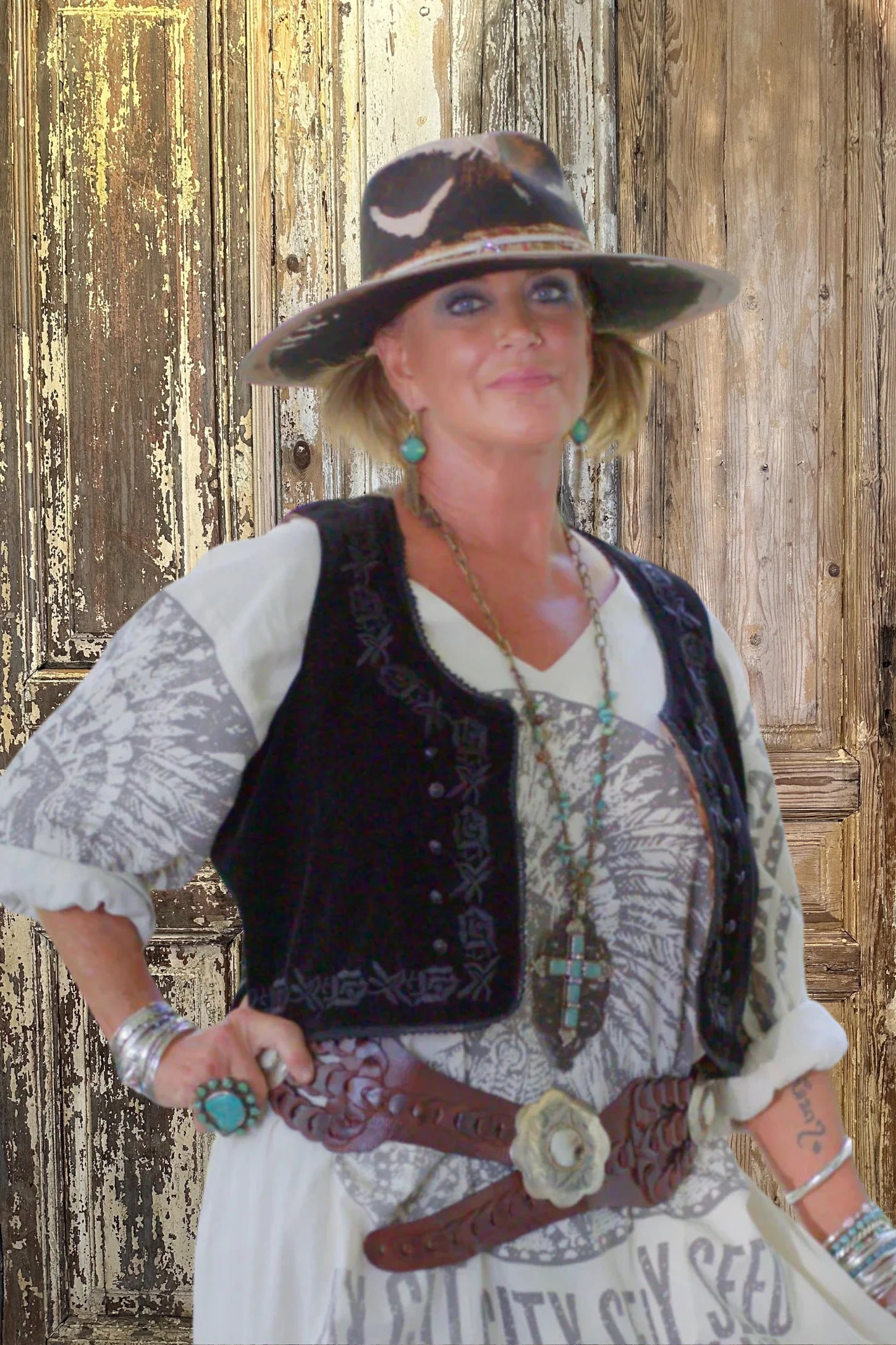 With its soft velvet feel, low neckline, embroidered front design, and tiny mini button closure, this cropped vest is made to style over tees, dresses, blouses — whatever you’re feeling that day. It’s lightweight, wearable, and full of retro attitude, turning a simple outfit into something that looks collected, intentional, and just the right amount of funky.
