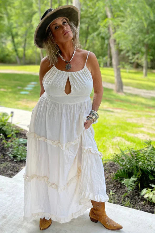 Float through your day in the WC Dress 3, the effortlessly romantic maxi dress your wardrobe has been waiting for. Made from 100% breathable cotton, this flowy beauty is as comfy as it is dreamy. The ruffle details add a touch of whimsy, while the keyhole front keeps things subtly flirty. Adjustable spaghetti straps ensure the perfect fit, and the easy, breezy silhouette makes it a joy to wear from sunrise to sunset.