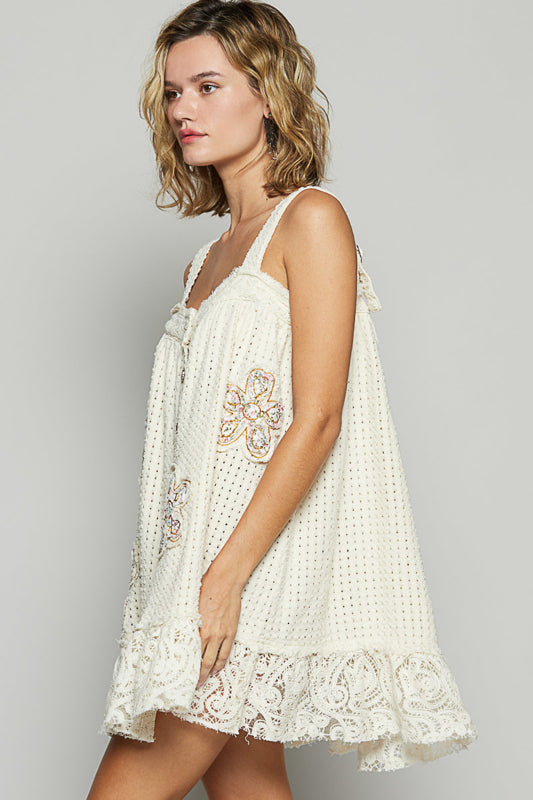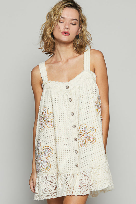 The Woven Flower Patch Jumper is all about effortless boho charm with a touch of vintage magic. Designed in a textured woven fabric, this short dress features crochet flower patches,  and soft shirring for a beautifully relaxed silhouette. The raw edges give it that perfectly worn-in, up cycled look, while the vintage wash keeps it feeling timeless and easygoing.