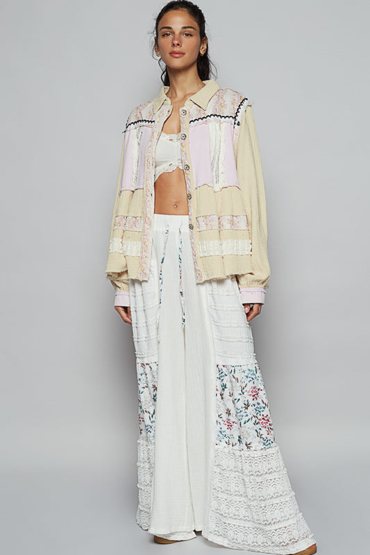 flower fabric mix button-down front adds a soft, feminine touch, while exposed outseam stitching gives it a hand-crafted, worn-in vibe. Whether you wear it as a light outer layer or button it up as a standalone top, it’s effortlessly cool and endlessly wearable.